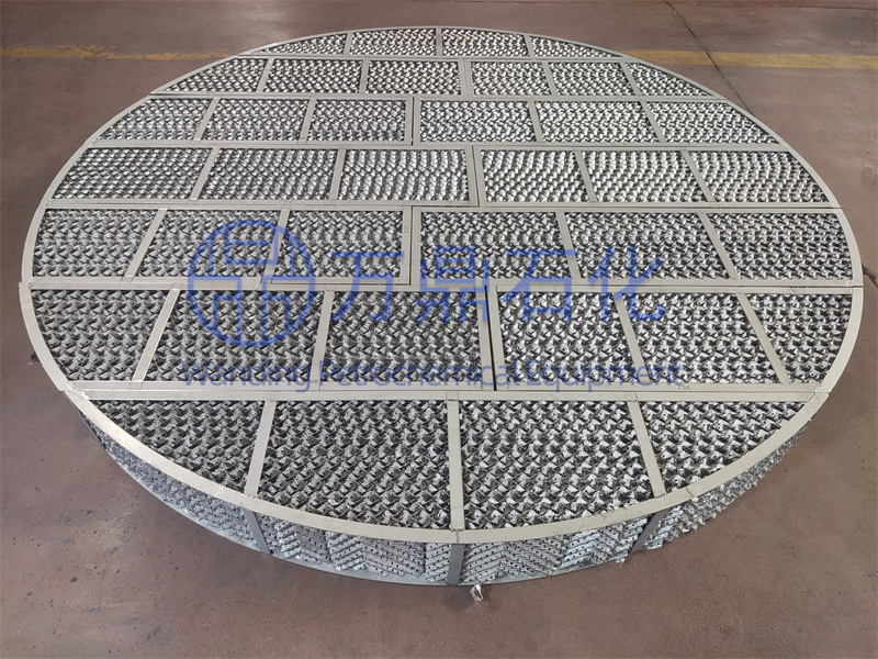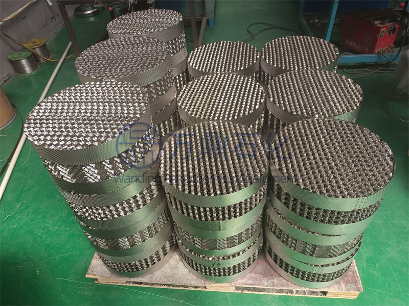 該填料的波紋板片上沖壓有許多f5mm左右的小孔,可起到粗分配板片上的液體、加強(qiáng)橫向混合的作用、波紋板上軋成細(xì)小溝紋,可起到細(xì)分配板片上的液體、增強(qiáng)表面潤(rùn)濕性能的作用。金屬板波紋填料強(qiáng)度高,耐腐蝕性強(qiáng)。
