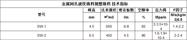網(wǎng)孔波紋填料SW-1/SW-2規(guī)整填料產(chǎn)品介紹:規(guī)整填料由于其結(jié)構(gòu)規(guī)則、均勻、對稱,規(guī)定了汽液流路,改善了溝流和壁流現(xiàn)象,具有阻力小、通量大、分流效率高等優(yōu)點,在精細化工、石油化工、化肥等眾多領(lǐng)域的塔器內(nèi)得到廣泛應(yīng)用。