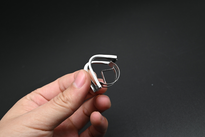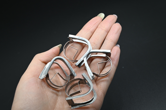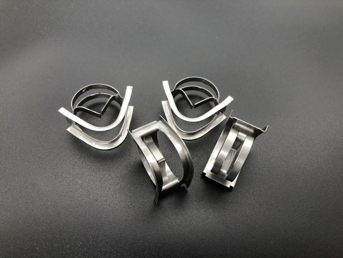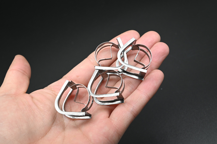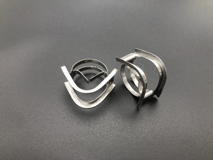 環(huán)矩鞍類的填料兼具了開孔環(huán)形填料和鞍形填料的結(jié)構(gòu)特征,金屬矩鞍環(huán)填料在20世紀(jì)70年代末制出,其結(jié)構(gòu)可分為兩側(cè),一側(cè)是兩邊為矩形的弧形表面,另一側(cè)是如環(huán)形填料的圓形結(jié)構(gòu),環(huán)壁處有數(shù)量不等的開孔,環(huán)內(nèi)有與開孔邊緣相連的內(nèi)伸舌片。金屬環(huán)矩鞍填料這一獨(dú)特的結(jié)構(gòu)有效防止填料堆填時(shí)發(fā)生重疊,增加單位填料層的比表面積,減小阻力,增大通量,最終達(dá)到提高效率的目的。